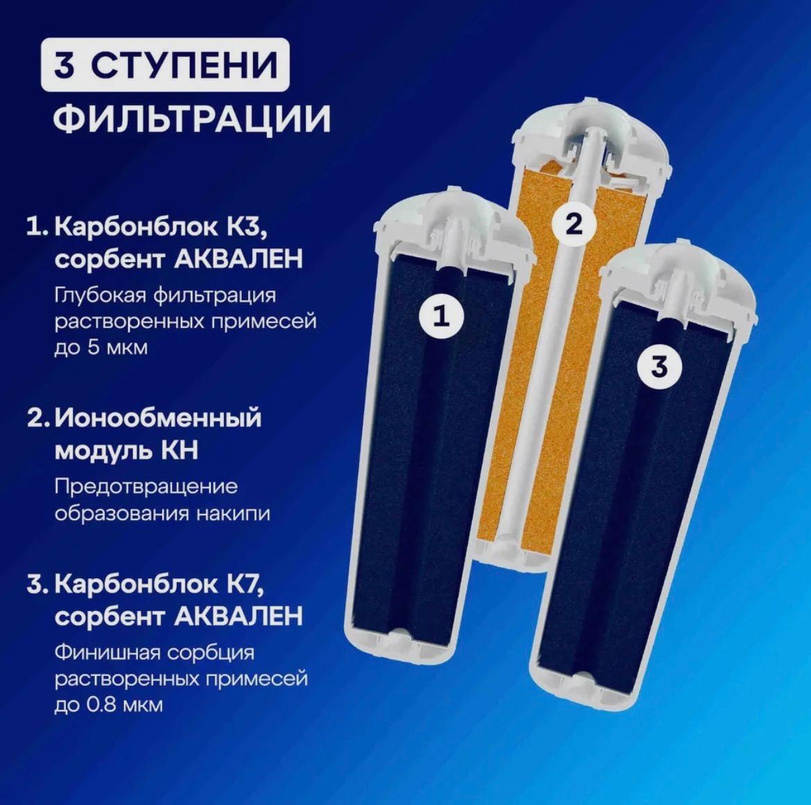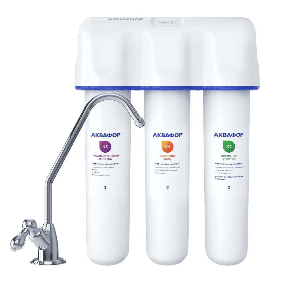 Надежный сорбционный фильтр для базовой очистки питьевой воды, приготовления супов и напитков. Обеспечит глубокую очистку водопроводной воды от целого спектра опасных загрязнений и замедляет образование накипи в воде средней жесткости. АКВАФОР Кристалл H удаляет хлор, тяжелые металлы, пестициды, нефтепродукты и другие распространенные токсины и аллергены, сохраняя минеральный состав воды. Сорбционные модули изготовлены по технологии карбонблок с ионообменным волокном АКВАЛЕН, поэтому площадь контакта воды с сорбентами в 42 раза выше чем у стандартных насыпных модулей, а скорость фильтрации в 4 раза выше. Сорбент также содержит безопасное серебро в отличие от серебрёных активированных углей. Умягчающий модуль KH эффективен для воды умеренной минерализации и подходит для многократного восстановления. Для показателей жесткости воды выше 5 мэкв/л регенерация потребуется слишком часто. В таком случае мы рекомендуем водоочиститель обратноосмотического типа серии АКВАФОР DWM.