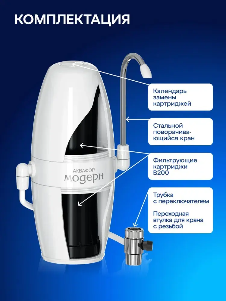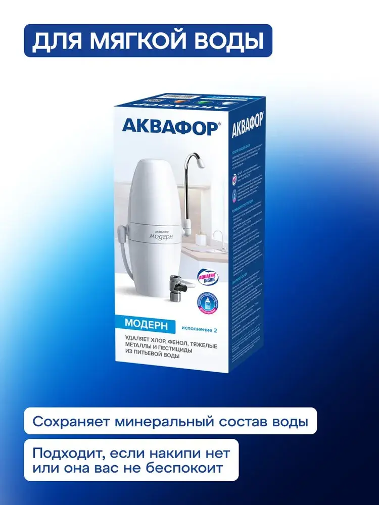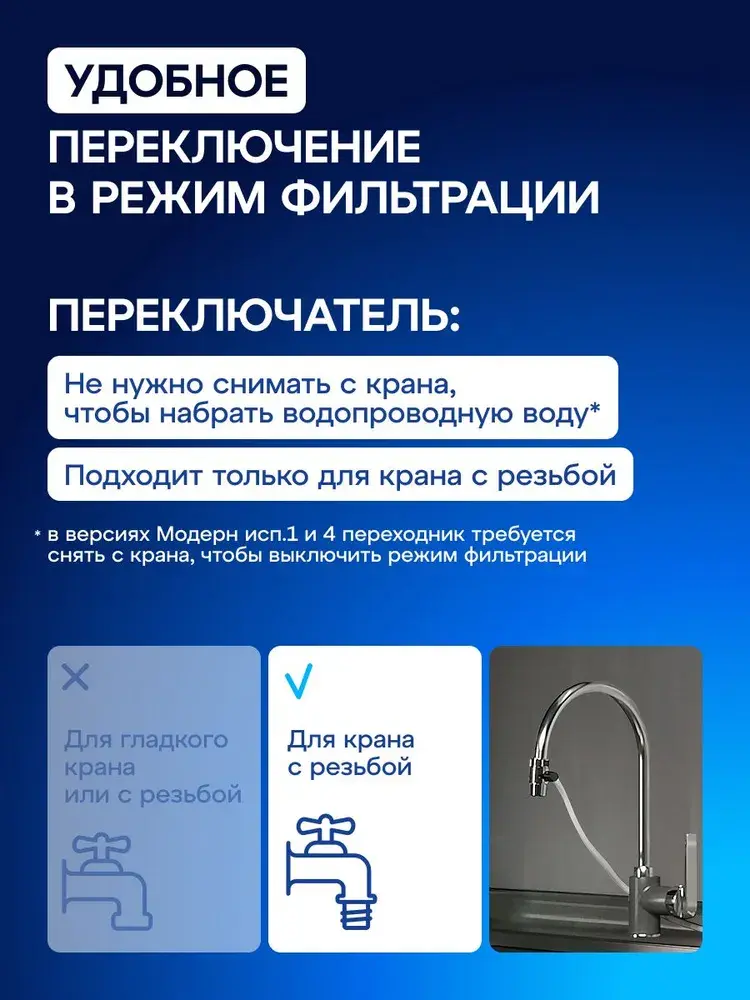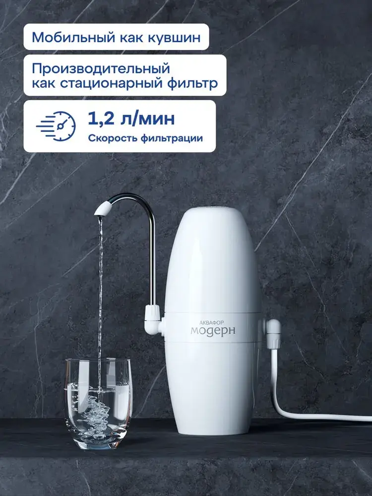 Мобильный фильтр для тех, кто снимает жилье, часто переезжает или по иным причинам не может подключить стационарную систему фильтрации. Два сменных модуля быстро и глубоко очищают от примесей, таких как активный хлор, нефтепродукты (бензол), фенол, пестициды, тяжелые металлы, при этом сохраняя в воде полезные минералы. Имеет календарь для напоминания о своевременной замене картриджа. Подключение фильтра к крану может быть как временным, так и постоянным, переключатель позволяет не отсоединять насадку от водопроводного крана, когда нужна нефильтрованная вода. Чтобы подключить Модерн, достаточно заменить аэратор смесителя на специальную переходную втулку и присоединить насадку. Она подходит к изливам как с наружной, так и с внутренней резьбой. Для кранов без аэратора в комплекте также есть переходная втулка.