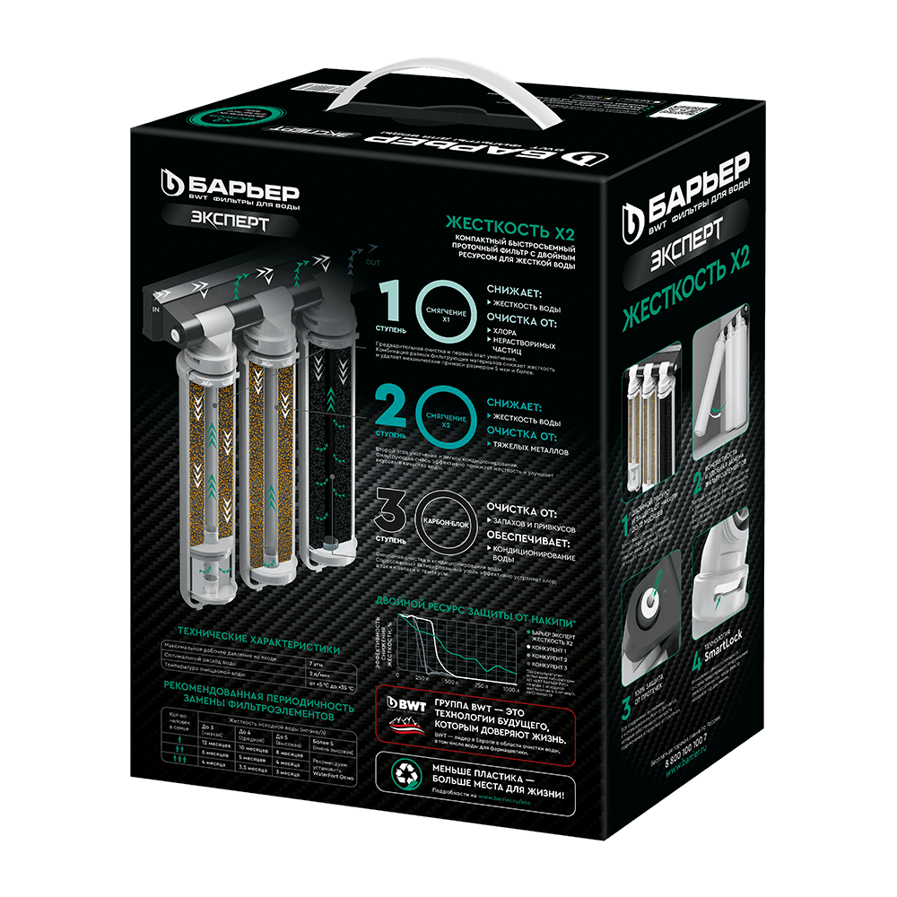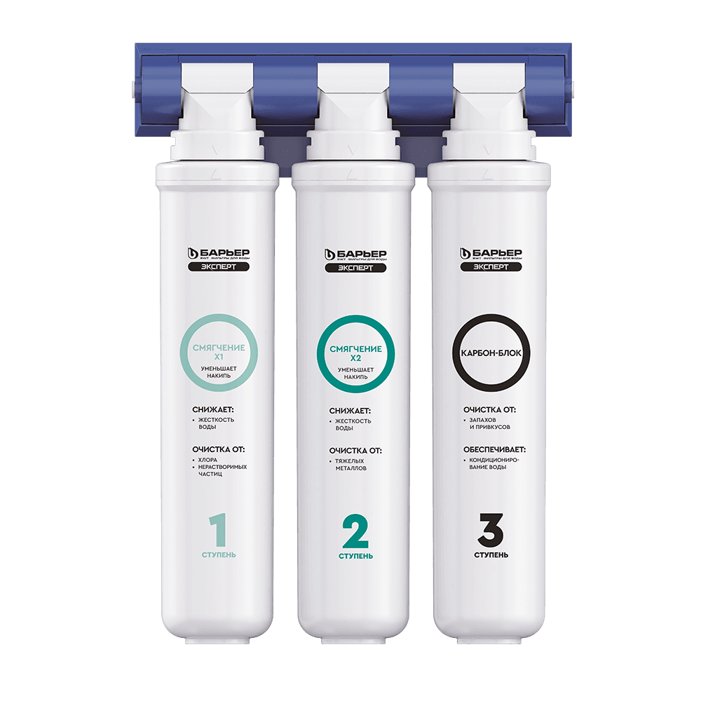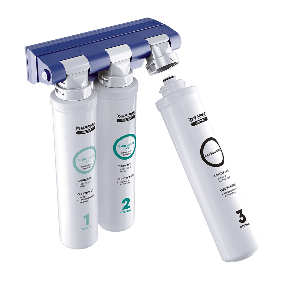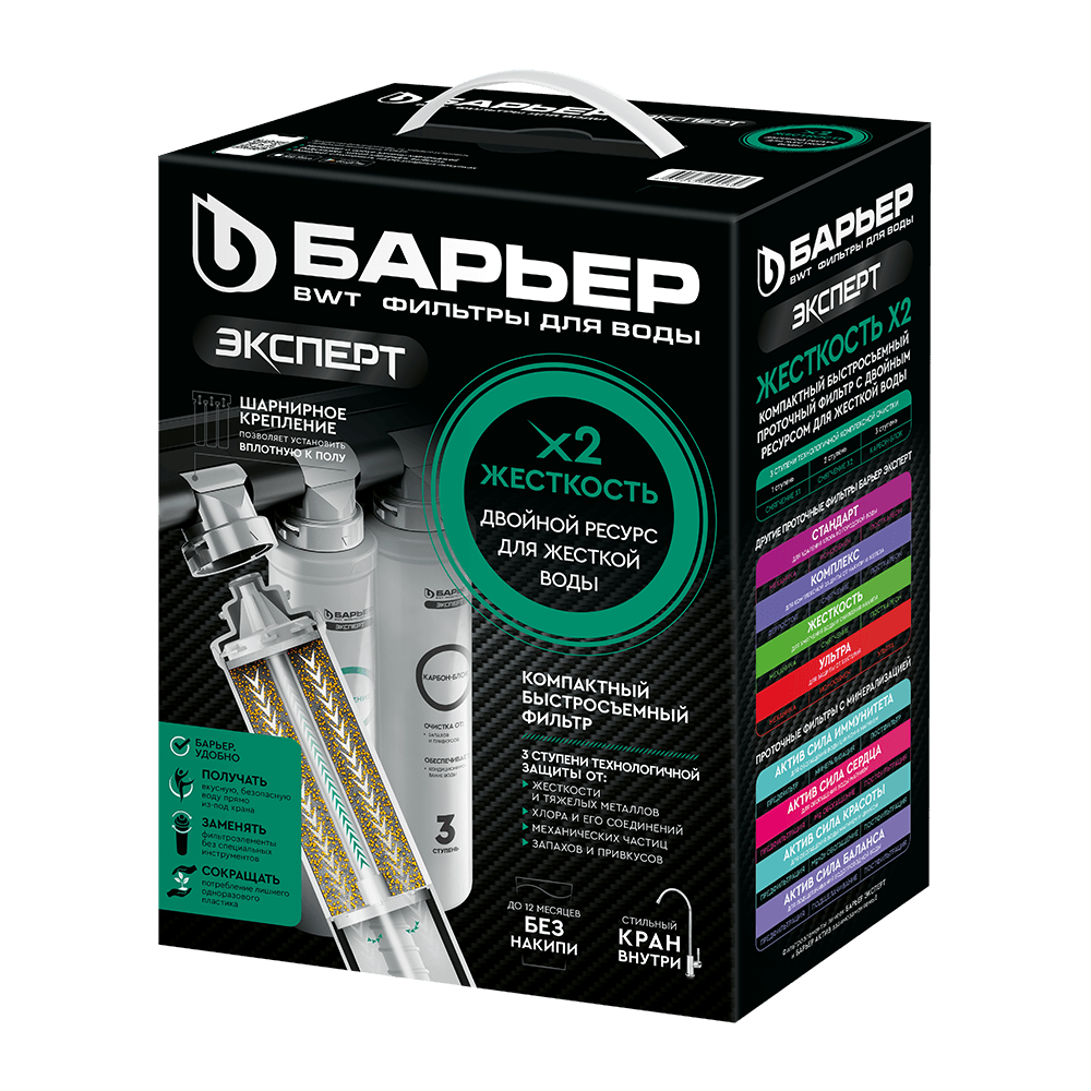 Двойной ресурс защиты от накипи. Подходит для жесткой городской воды. Не только умягчает воду, но и очищает ее от тяжелых металлов, хлора, посторонних привкусов и запахов. Производительность системы — 2 л/мин, ресурс до 12 месяцев. Конструкция фильтра для воды БАРЬЕР позволяет менять картриджи без инструментов, специальных ключей и навыков за 30 секунд, а компактные размеры — установить систему очистки воды под мойку даже на небольшой кухне. Вода проходит три этапа очистки: 1 ступень — БАРЬЕР ЭКСПЕРТ Смягчение X1. Сочетание сорбционной и механической очистки, предварительное умягчение. Удаляет соли жесткости, тяжелые металлы, соединения хлора и механические частицы. 2 ступень — БАРЬЕР ЭКСПЕРТ Смягчение X2. Сорбционная очистка и второй этап умягчения. Удаляет остаточные тяжелые металлы и соли жесткости. 3 ступень — БАРЬЕР ЭКСПЕРТ Карбон-Блок. Убирает остаточные соединения хлора, кондиционирует воду и улучшает ее вкусовые свойства. В комплекте стильный кран для чистой воды.