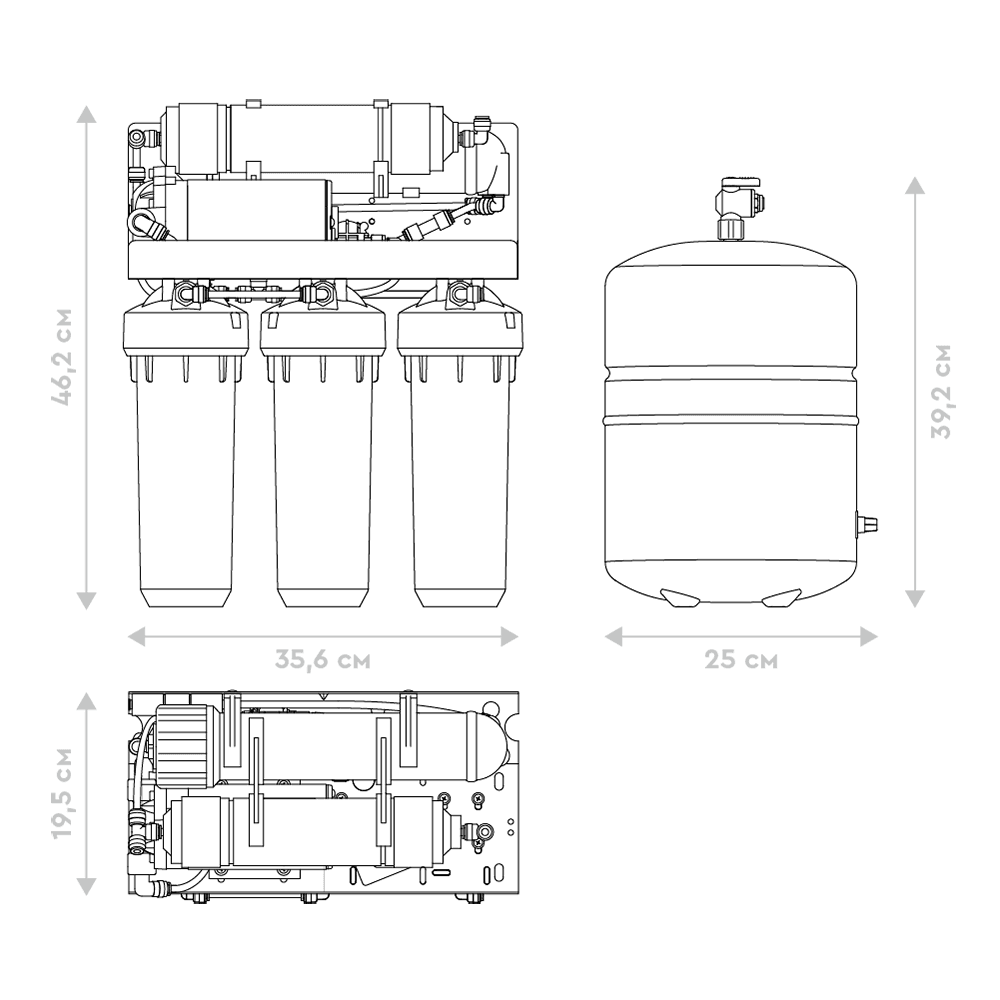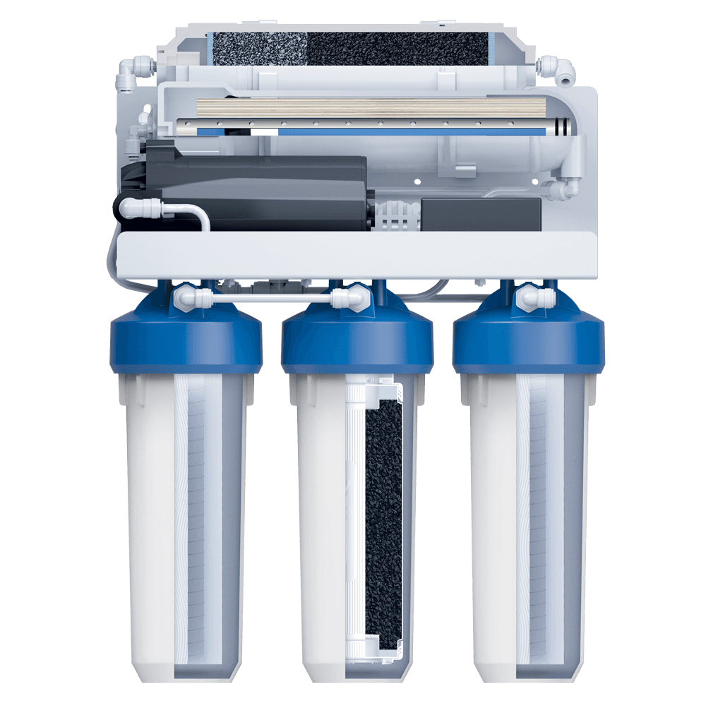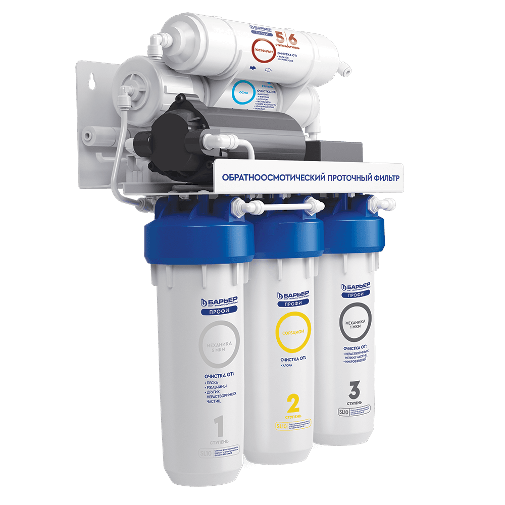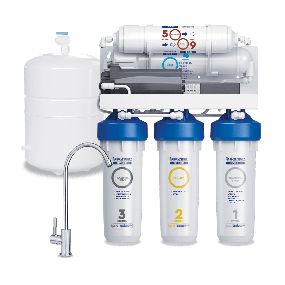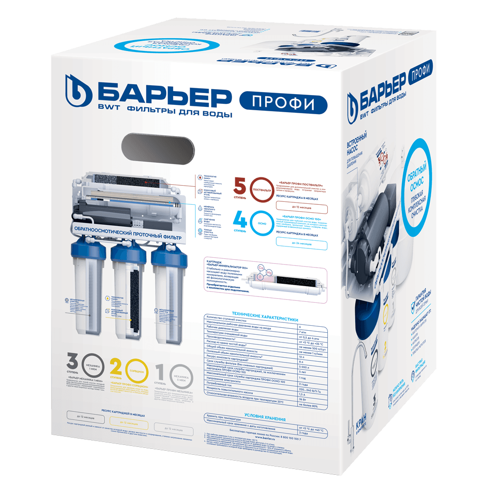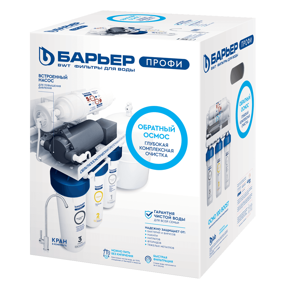 Очищает воду до 100%, удаляя все примеси, включая соли жесткости — причину накипи, бактерии и вирусы. Подходит для доочистки как после городского водопровода, так и после коттеджной системы. Благодаря повысительному насосу в комплекте может использоваться даже при низком давлении в водопроводе. Производительность фильтра — не менее 1 л/мин, ресурс — 5 000 литров. Рабочее давление — от 0,5 до 4 атм. Пятиступенчатый фильтр обратного осмоса в корпусе классического исполнения с картриджами стандарта Slim Line 10. Вода проходит 5 этапов очистки, включая обратноосмотическую мембрану. Тонкопленочный полиамидный композит, из которого изготовлена мембрана, очищает воду на молекулярном уровне до 100%, задерживая всевозможные примеси, включая бактерии и вирусы. Вода после фильтра обратного осмоса не уступает по качеству бутилированной. Показатели после фильтрации: общая минерализация — до 50 ppm, pH в диапазоне 6-9. Показатель минерализации может варьироваться в зависимости от условий эксплуатации и водопотребления. Вместительный бак для большого запаса чистой воды: общий объем накопительной емкости 12 л (полезный — 8 л). Соотношение чистой воды и дренажа — 1:3, то есть при одном литре кристально очищенной воды в дренаж уходит 3 литра с примесями. При этом вода из фильтра обратного осмоса выгоднее для семейного бюджета, чем бутилированная в 10-11 раз. Для работы насоса необходимо наличие розетки в зоне установки фильтра.