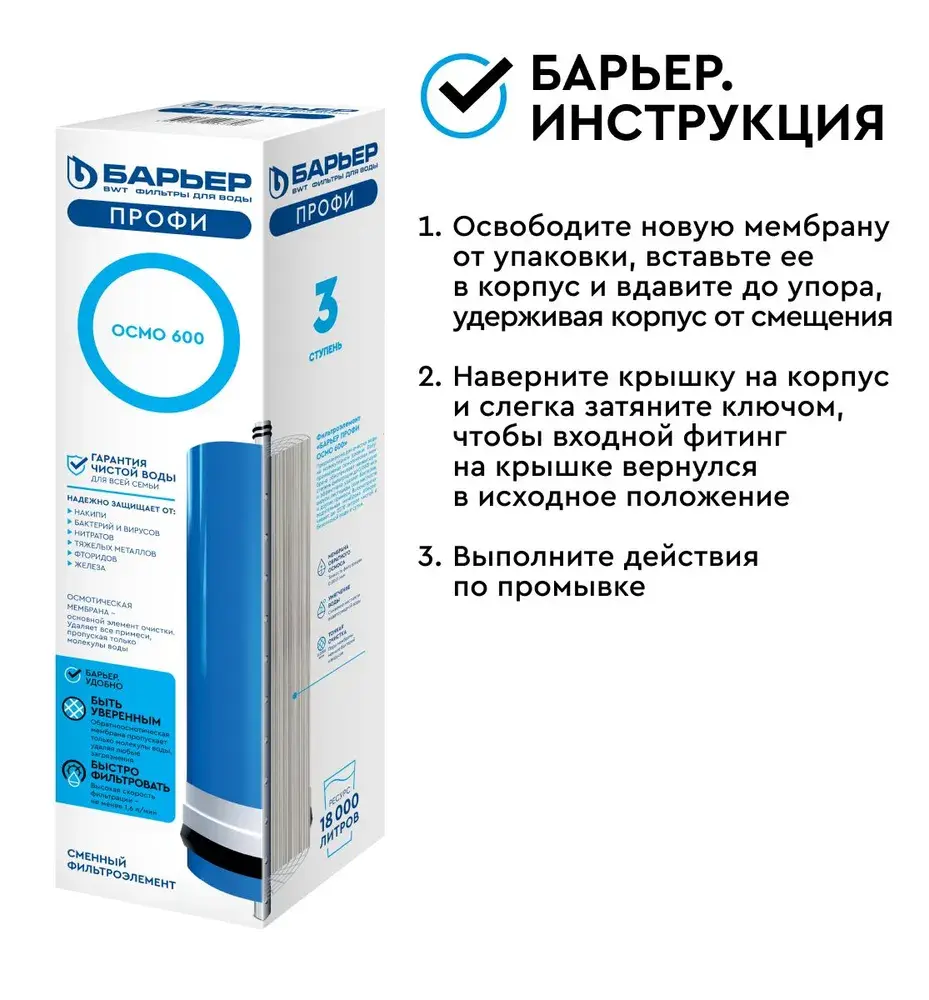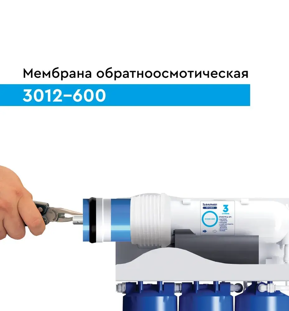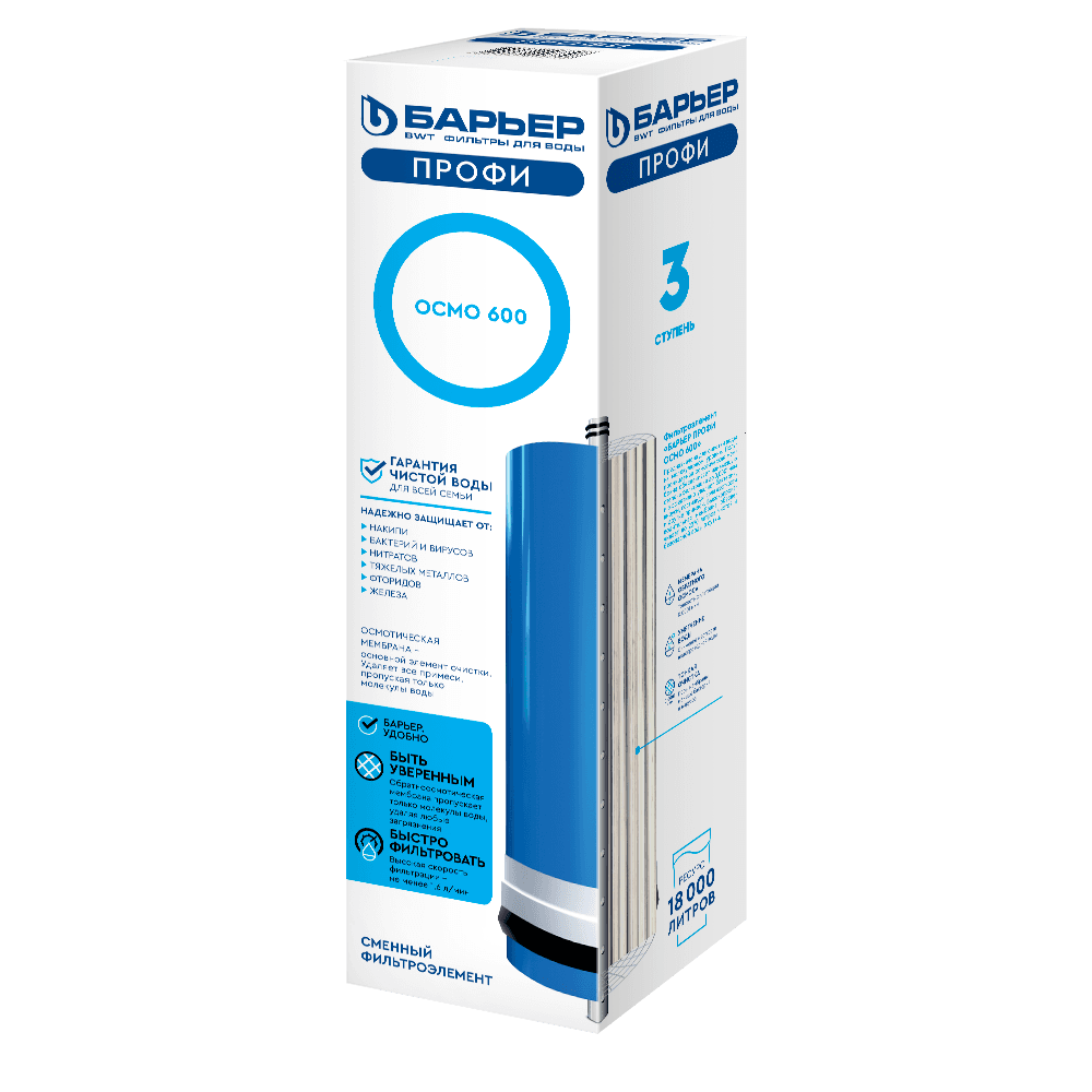 Обратноосмотическая мембрана БАРЬЕР ПРОФИ Осмо 600 используется в качестве третьей ступени в фильтре БАРЬЕР ПРОФИ Осмо 600. Ресурс зависит от качества исходной воды, но не более 18 000 литров. Производительность 2270 литров в сутки (600 галлон). Рекомендуемая частота замены – один раз в 12–18 месяцев. Обратноосмотическая мембрана очищает воду от примесей на молекулярном уровне. Пропускает только молекулы воды, задерживая бактерии и вирусы, соли жесткости, нитраты, нитриты, фториды, тяжелые металлы. Мембрана БАРЬЕР ПРОФИ Осмо 600 предназначена для замены ТОЛЬКО в фильтре ПРОФИ Осмо 600, с остальными фильтрами семейства БАРЬЕР ПРОФИ Осмо картридж не совместим. Комплект картриджей 1, 2 и 4 ступеней приобретается отдельно.