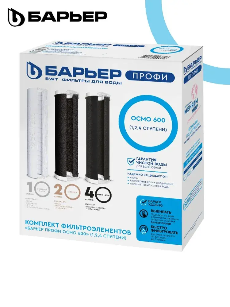 Комплект фильтроэлементов для обратноосмотического фильтра БАРЬЕР ПРОФИ ОСМО 600. Устанавливается в качестве 1, 2, 4 ступеней. В комплект входит: 1 ступень: ПРОФИ Механика 5 мкм – Картридж предварительной очистки холодной воды от песка, ржавчины и других нерастворимых примесей. Выполнен из высококачественного полипропилена с тонкостью фильтрации 5 мкм. Формат: SL10. Ресурс: 10 000 литров. Зависит от качества исходной воды. Рекомендуемая частота замены – 12 месяцев. 2 ступень: ПРОФИ АНТИХЛОР – Картридж обеспечивает безупречную очистку от хлора и хлорорганики, фенольных соединений, осуществляет дополнительную механическую очистку. Формат: SL10. Ресурс: 10 000 литров. Зависит от качества исходной воды. Рекомендуемая частота замены – 12 месяцев. 4 ступень: ПРОФИ Карбон-блок – Улучшает вкусовые качества и запах воды. Формат: SL10. Ресурс: 10 000 литров. Зависит от качества исходной воды. Рекомендуемая частота замены – 12 месяцев.