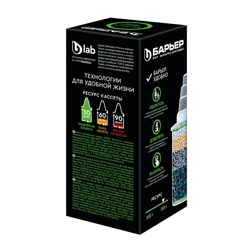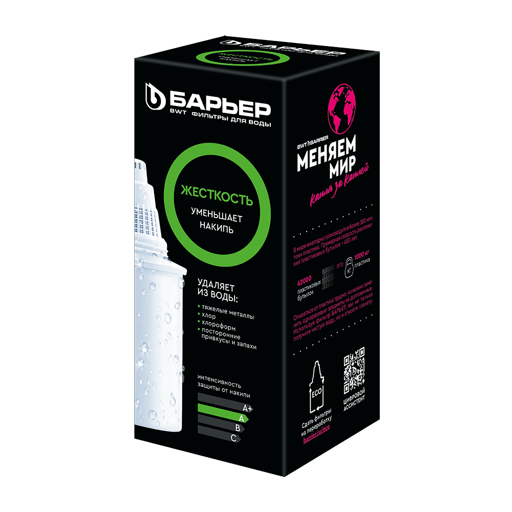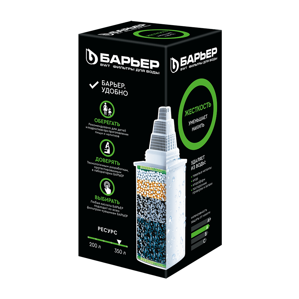 Сменная кассета для фильтра БАРЬЕР Жесткость предназначена для очистки воды от солей жесткости, которые мы привыкли встречать в жизни в виде накипи в чайнике, кофе-машине и налете на кухонном кране. Кассета БАРЬЕР Жесткость снижает образование накипи, а также удаляет основные вредные примеси, оставляя только свежую чистую воду. Ресурс — 350 литров. С фильтрами БАРЬЕР вам не придется запоминать размер или диаметр сменной кассеты: любая кассета БАРЬЕР подходит ко всем фильтрам-кувшинам БАРЬЕР. А герметичное резьбовое соединение исключает попадание неочищенной воды в отфильтрованную. Ресурс зависит от качества исходной воды, но составляет не более 350 литров. Использование фильтра-кувшина вместо литровых бутылей на постоянной основе выгоднее в 165 раз и помогает уберечь планету более чем от тонны пластика.