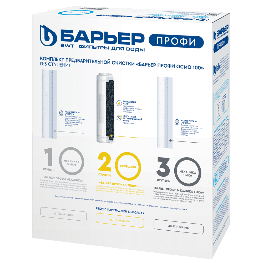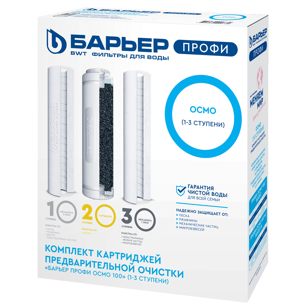 Комплект сменных картриджей формата SL10 для обратноосмотических фильтров семейства БАРЬЕР ПРОФИ Осмо. Устанавливается в качестве 1-3 ступеней, подготавливает воду к мембране. Совместим с фильтрами обратного осмоса других производителей стандарта SL 10. Ресурс комплекта — 20 000 литров. Рекомендуемая периодичность замены - 1 раз в 6 месяцев. В комплект входит: 1 ступень — БАРЬЕР ПРОФИ Механика 5 мкм. Удаляет любые механические примеси более 5 мкм (песок, пластик, ржавчину и т.д.). 2 ступень — БАРЬЕР ПРОФИ Сорбцион. Защищает мембрану обратного осмоса от хлора и его соединений. 3 ступень — БАРЬЕР ПРОФИ Механика 1 мкм. Финишная механическая очистка нерастворимых мелкодисперсных механических примесей размером более 1 мкм. Для замены и установки сменных картриджей потребуется ключ из комплекта фильтра для воды БАРЬЕР ПРОФИ Осмо.