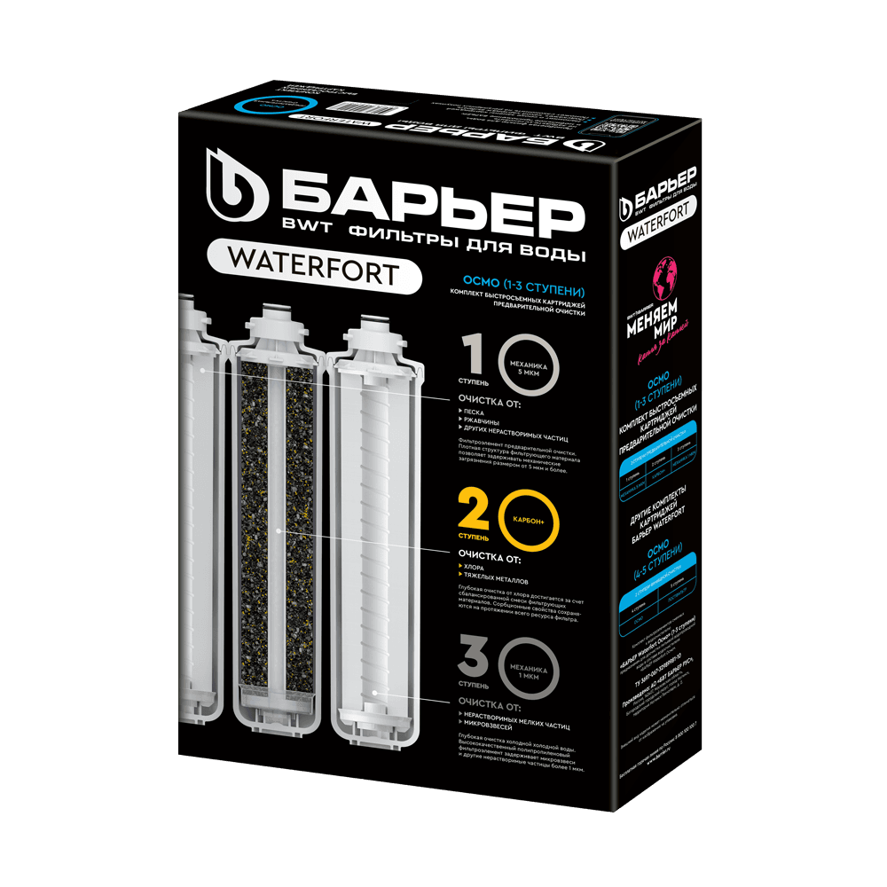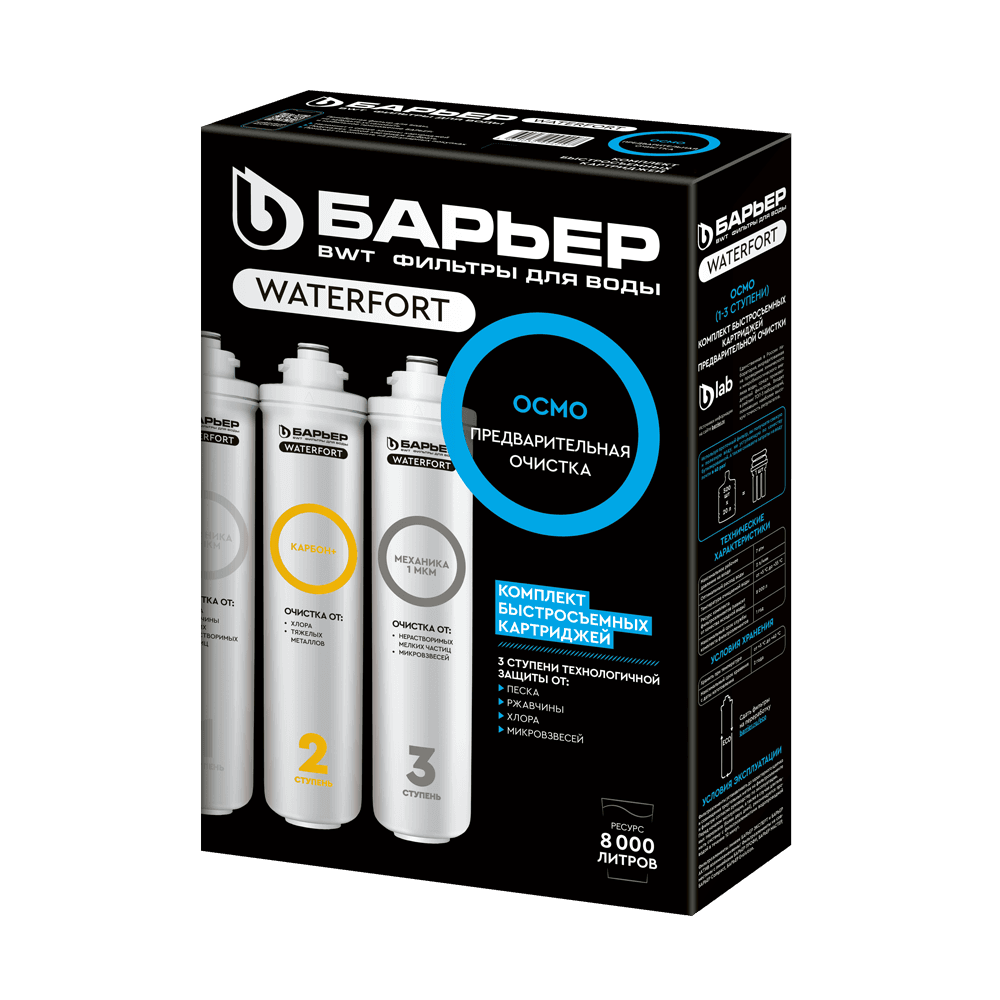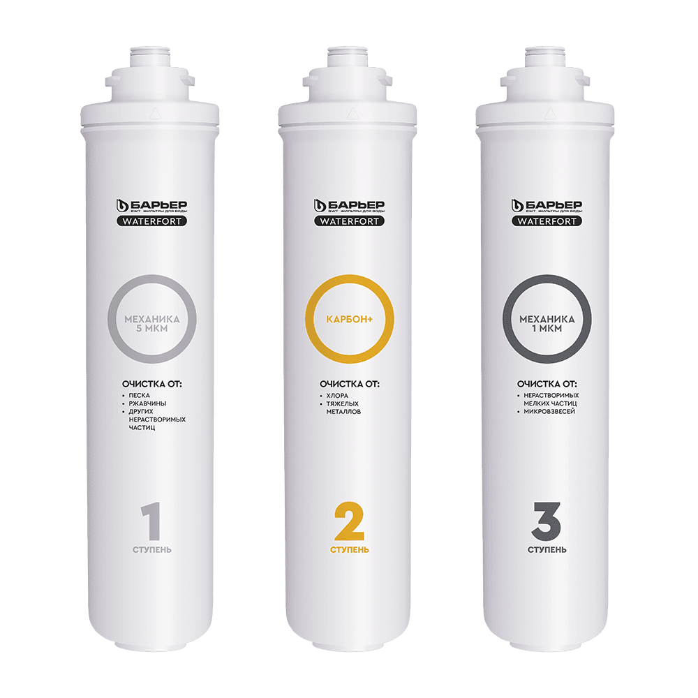 Комплект сменных быстросъемных картриджей предварительной очистки для обратноосмотического фильтра БАРЬЕР WaterFort. Устанавливается в качестве 1-3 ступеней, подготавливает воду к обратноосмотической мембране. Ресурс комплекта — 8 000 литров, рекомендуемая периодичность замены - 1 раз в 6 месяцев. В комплект входит: 1 ступень — БАРЬЕР WaterFort Механика удаляет любые механические примеси до 5 мкм (песок, ржавчину и другие механические примеси). 2 ступень — БАРЬЕР WaterFort Карбон+. Защищает мембрану от хлора, хлорорганических соединений, тяжелых токсичных металлов. 3 ступень — БАРЬЕР WaterFort Механика 1 мкм. Финишная механическая очистка от мелкодисперсных взвесей размером более 1 мкм. Комплект картриджей совместим ТОЛЬКО с фильтром БАРЬЕР WaterFort. Не требует для замены специальных ключей, инструментов или навыков.